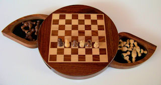 Sehr schönes rundes Magnetschach aus Holz Palisander/Weißholz Intarsie mit 2 KLappladen zur Aufbewahrung der Holzfiguren, Durchmesser 22,5cm, Feldgröße 20mm, Königshöhe 35mm